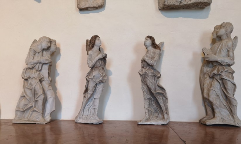 Before you go do read up a little because the guide, being a monk is not an art historian. The ground plan is a Latin cross with chapels opening along the aisles; 12 square ones and 2 rectangular ones. As they are decorated by painters of the stature of Perugino, Bergognone, il Morazzone, Procaccini, il Guercini it would have been very nice if they had been better lit. Not only do you have to try and find a good viewing position through the wrought iron bars that protect them , but it’s extremely difficult to see them. I think the problem is that it all belongs to the monks who are still praying for Gian Galeazzo (in perpetuity) and they are more interested in the spritual dimension. Elsewhere you’ll find Bernadino Luini’s outstandingly beautiful ” Madonna of the Carnation”. The gipsoteca is well worth a visit, and should be more than a hurried afterthought to your visit. Back to Milan. I want to go into the station to buy a slice of pizza. I approach the trendy young man at the barrier and he says” NO”. What? That’s a word I don’t often hear.” But I only want a slice of pizza. I’ve been on one of your trains today. I’ve got an underground ticket.” Still no. “Ok where can I buy a platform ticket?”” You can’t. You have to be going somewhere”. Damn, I’m not used to no’s. I go to look for the pizza place on the other side of the barrier but of course he actually meant outside the station, so I march back forcefully to complain. Another barrier attendant evidently fearing my wrath or maybe pitying a poor, tired soon-to-be extra-communitarian, waves me in. Thanks, sometimes Italian rule- bending works in one’s favour!