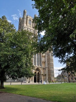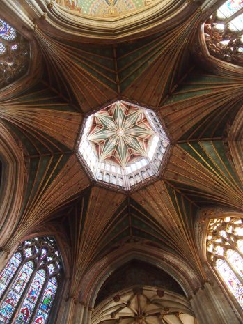 After lunch, fish’n’chips of course, one of the gastronomic delights of home, we made our way up to the Cathedral, known as “The Ship of the Fens” because in fact, Ely was once an island. The cathedral was begun in the eleven hundreds, and when the fens were drained from the 17th century onwards the cathedral was left standing upon its mound (the Isle of Ely) but it had previously been surrounded by marshes, rivers and peat beds. The cathedral suffered dissolution by Henry VIII when almost all of the” idolatrous” statues were destroyed by the iconoclasts. But that’s not the only disaster to have struck this most beautiful building. In 1322 the tower over the crossing of the nave and transepts, collapsed into the choir. It was redesigned by Alan of Walsingham, unusually with 8 pillars, thus octagon, and made with huge wooden tree trunks to lend it light both weightwise and because it illuminates the choir. Unfortunately this miracle of medieval architecture came under attack by the death watch beetle and as long as I can remember the cathedral has being trying to conjure up funds to pay for restoration.
