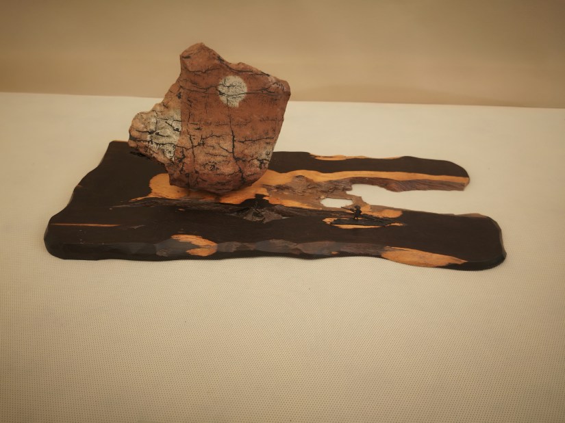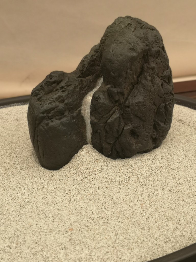 The other things which really floored me were the breathtaking rocks presented like precious artifacts and given a place of honour in Japanese homes. Suiseki( the art of appreciating stones formed by wind and water and suggesting stability,longevity and immortality) It’s interesting how these extremely costly items are born of……nothing (the little tables they’re exhibited on plus the shallow vases they stand in on beds of sand or water are worth thousands of euros ) And they are just a bits of rock picked up and contemplated until they surrender their meaning. The equilibrium, the structure, the colours give them their power of suggestion