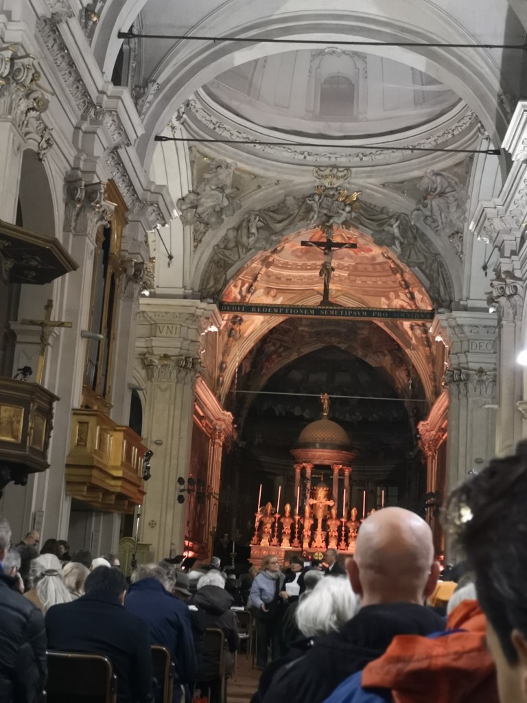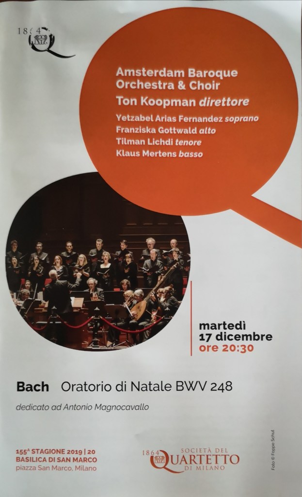 Tuesday: Bach’s magnificent, monumental Christmas Oratorio, one of the recurring joys of the musical year. This one was particularly special because it was performed by the Amsterdam Baroque orchestra and choir directed by none other than Ton Koopman. A quick walk through Brera to the Basilica di San Marco, long queues in the pouring rain, on a first come first served basis. I got a seat halfway down but in these cases it’s the ears that count. The acoustics seemed pretty good and it’s wonderful to hear these pieces performed in the places they were written for, presumably churches, it just seems right somehow.