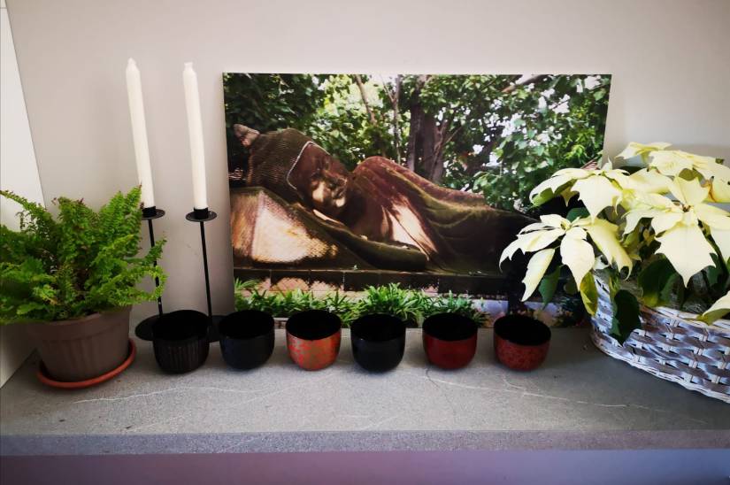 My Human has been changing things around in our house. She’s taken down an awful picture of a very depressed-looking woman that looks like a younger version of herself and put up a rather beautiful Buddha picture, he’s lying down in bliss . It’s bad for humans to be depressed; they have no real understanding of themselves because they have something they call “Past” and something they call “Future”. I hear her talking about it almost every day when she’s teaching her students. Now, if they would all just live in the “now”, the now in which they are smiling at each other , and laughing, surely that would be better? It is Anne’s fault too because she tells them ” Next week, we’ll do blah blah blah…”