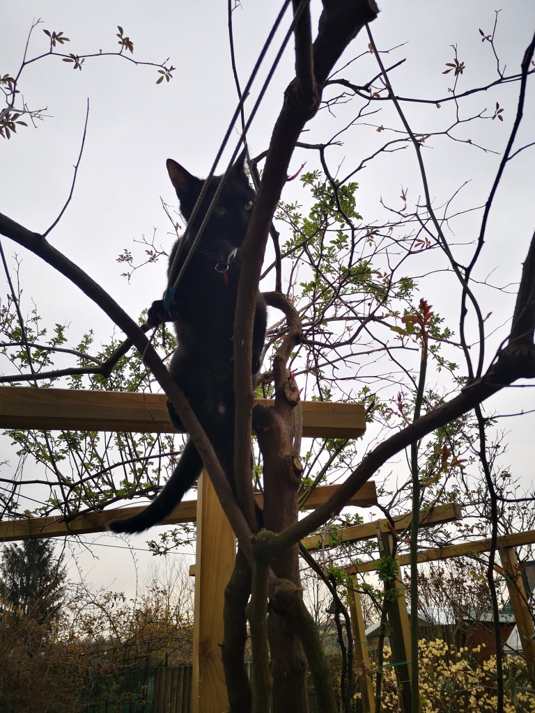 She does something she calls reading. It’s extremely boring because it’s just made up of black strokes and they don’t even move! (I know they have some moving pictures on that screen she works with) but I have found out that if I put my paw in front of her eyes she has to stop and look at me. I realise more and more how many defects these poor humans have: I don’t think she can see at night so that’s probably the reason she doesn’t go out, of course I’ve got perfect night vision. She sometimes does go out to take photos of her white flowers at night though, so perhaps it doesn’t depend only on her eyes. She does come out to play in the garden during the day and it’s great fun . While I claw up her pergola she has to go and get a stepladder to reach the top and once she’s there , she ties knots: she sometimes shouts at me because I can pull the knots wide open before she has finished tying them!