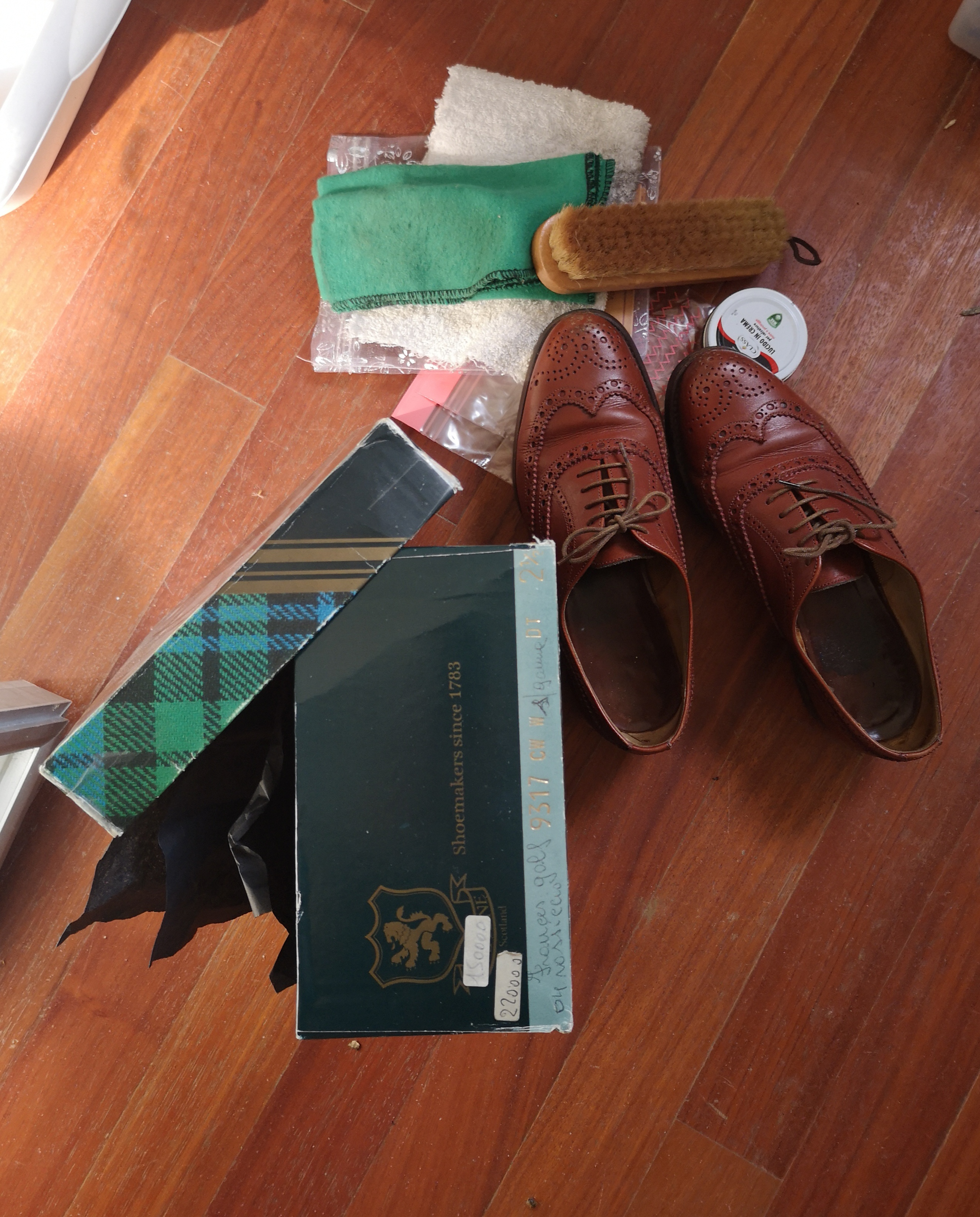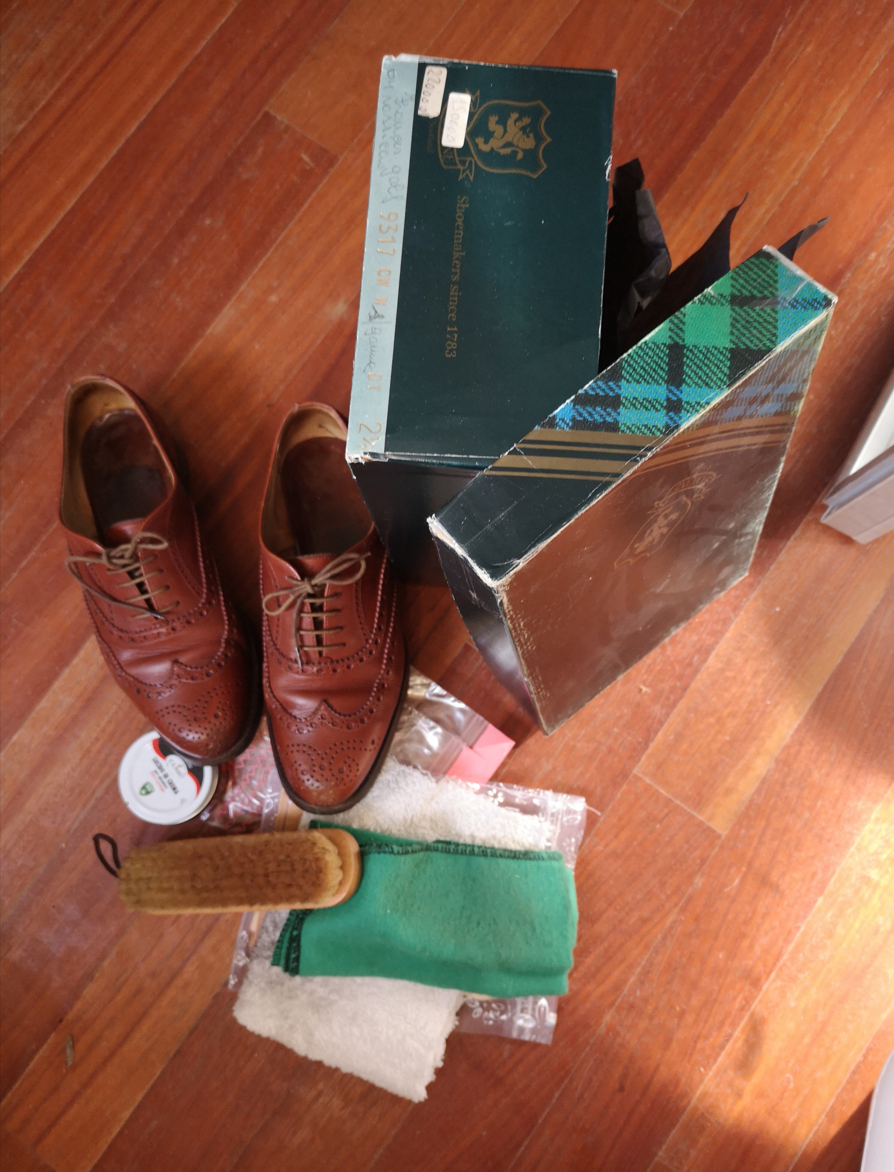 I absolutely love cleaning shoes and I feel quite cheated by these easy-care plastic-y things we wear on our feet today! It brings back memories of home. When I was a kid my Sunday-morning job was to clean all the boots and shoes in the house. My grandfather’s Sunday boots were high ,soft black leather which you could work up to a really good shine; grandmother’s were usually black, very misshapen because of her bunions poor soul; my mum’s were normal, high-heeled court shoes generally in beige or tan, mine were ballerinas as befitted my age. I had a super harlequin pair but extremely trying to clean (all those different colours) Anyhow, I took great pride in all this. For the young people who have never cleaned any shoes, here’s how: first you brush off the dirt and dust, then you rub in the cream, then you shine with your black or brown shoe brush, and finally you buff the already -shiny shoes to a mirror-like quality!