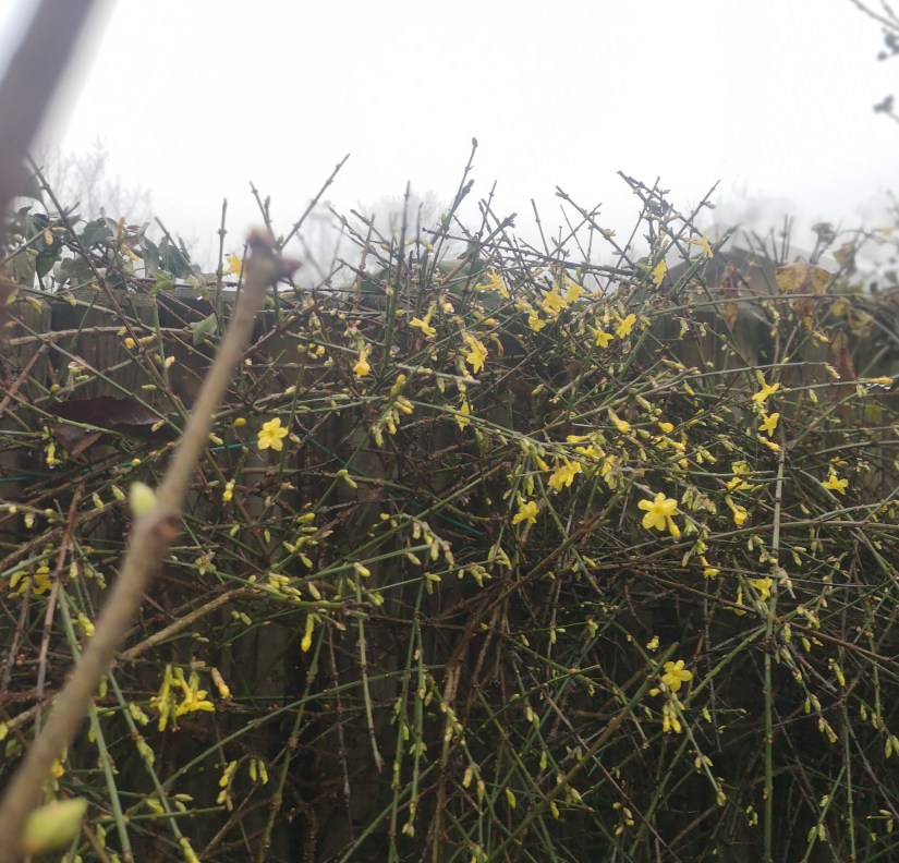 In the far corner behind the edgeworthia which will pretty soon make breathing a treat, I have a starscape of yellow winter jasmine. It was supposed to be a waterfall but my neighbour who must’ve misinterpreted my intentions as territorial, cut the long shoots off. Talking of shoots, I’m still on my knees but now on my hands and knees crawling into the space I’ve made under the big shrubs (Osmanthus) to find? I believe they might be snowdrops but not being a galantophile, I ‘m not sure