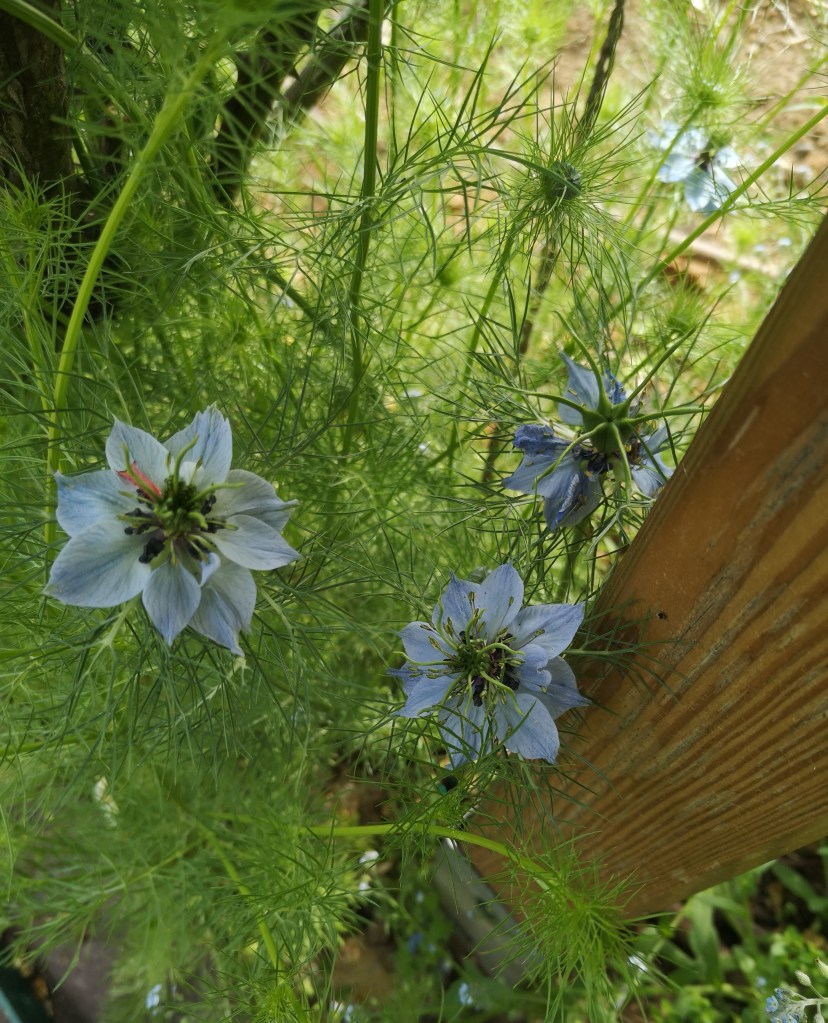 And now it’s the turn of the love-in-a-mist. Beautiful sky blue Nigella; I did have some very dark blue ones a couple of years ago, but then again, you accept what nature offers (although I do weed out the muddy pink ones which totally spoil my blue mood)